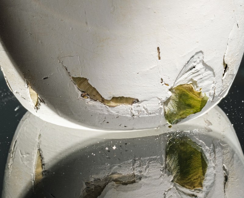 Het gieten van het dunste doorschijnende eierschaal porselein is als een oefening in vooruitzien op een toekomstig klimaat om de poëzie van Aardse kwetsbaarheid en vergankelijkheid tot uitdrukking te brengen.