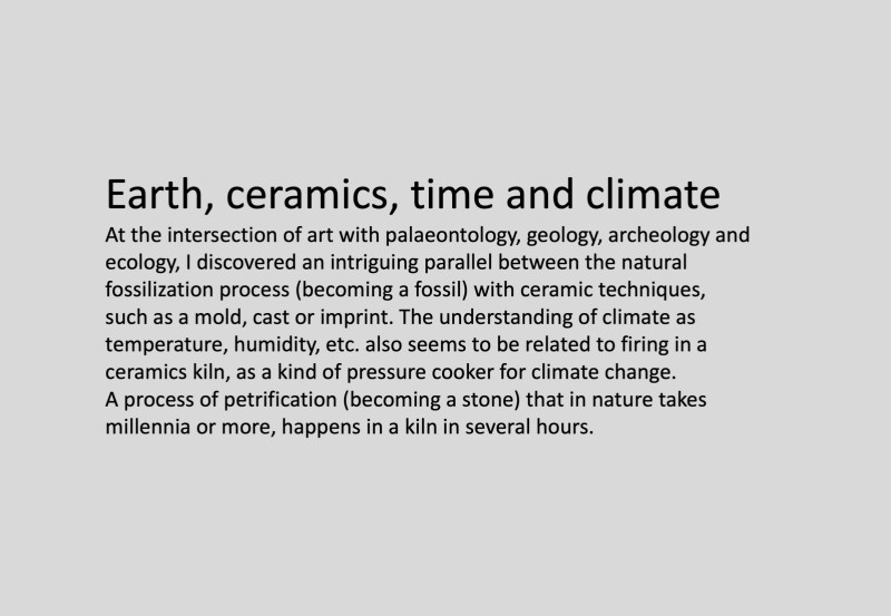 Recent artist-in-residencies at BC3, Basque Centre for Climate Change in Bilbao 2019; EKWC, the European Ceramics Work Centre in 2020; EKWC in 2021; Zone2Source Amsterdam 2021; Cascadas Artspace Barcelona 2022; Zone2Source Amsterdam 2022; ClayKitchen Portugal 2023; Zone2Source Amsterdam 2024; Kouraku Kiln in Arita, Japan in autumn 2024, with special thanks for the Research Grant by Stroom The Hague; Cool Clay Collective Rotterdam in 2025, with special thanks to funding by Van Achterbergh-Domhof Foundation, the Natural History Museum Rotterdam, Bram Langeveld, Bert van der Valk, Sander Alblas, Yvo van Os, Vuur Collective Amsterdam and Cool Clay Collective Rotterdam.
