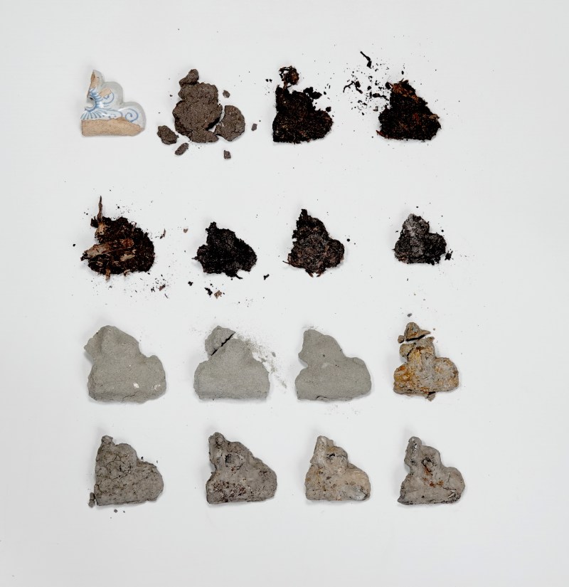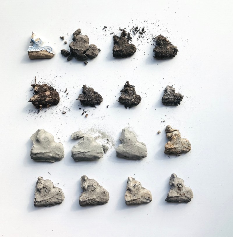 During my artist-in-residency at Sundaymorning@ekwc (2020), the international centre-of-excellence for ceramics, I made a 3-d scan and mold of the archeological artifact, a shard of a 17th century porridge bowl I had found on the surface of ‘Land in Wording’, as an index fossil dating back to the same time as the first mention of country estate Amstelrust (1635) on the river Amstel. During the public intervention ‘Onland’ (2019) I drilled in the soils of this man-made swamp called ‘Land in Wording’, and collected 10 meters of subsurface soils with a time-depth of approx. 6000 years. During the drilling I was confronted with an uncomfortable sensation: people, plants and animals breathe, but earth also breathes…..