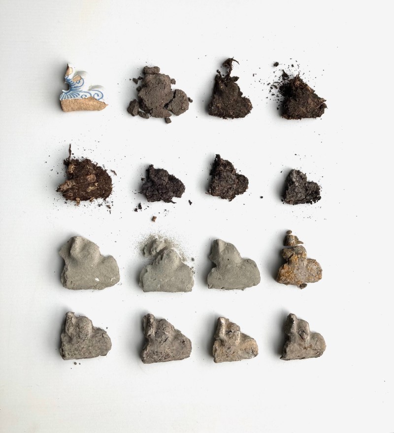 With this mold and the collected subsurface soils, I started to work on the in-between-ness of art & heritage with soil. During the process of working with unfired matter – as a supposed reversible process – I experienced again an uncanny sensation: the subsurface peat shrinks, thus visualizing the sequence of peat, carbon storage, oxidation, land subsidence…and this process is irreversible…