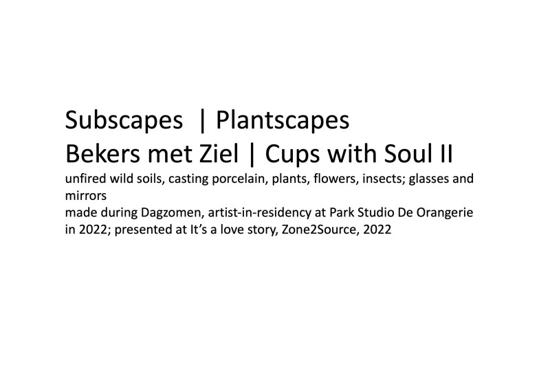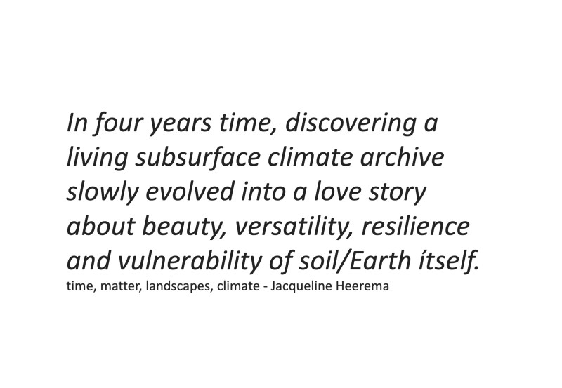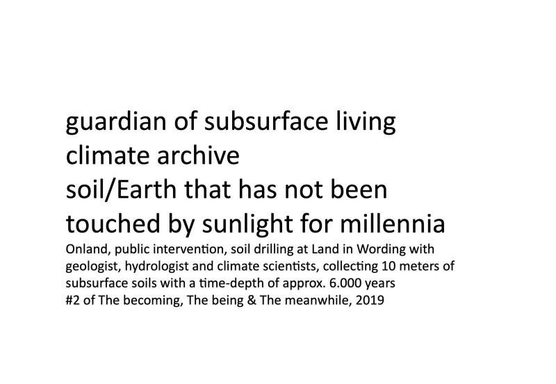 2019-ongoing The becoming, The being & The meanwhile; subsurface as living climate archive; empirical artistic field research themed around Land in Wording, Amstelpark, Zone2Source Amsterdam; #1 Genesis, #2 Onland; Guardian, #3 Breath of Soil(s), #4 Soft Soils, #5 aardtijd, #6 toenadering, #7 foreshadowing | residual intimacy, #8 Soft Soils, aardtijd, #9 Gathering dust
