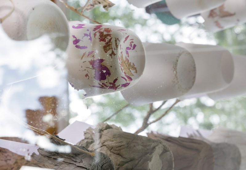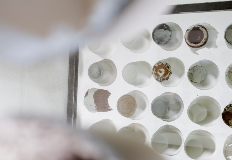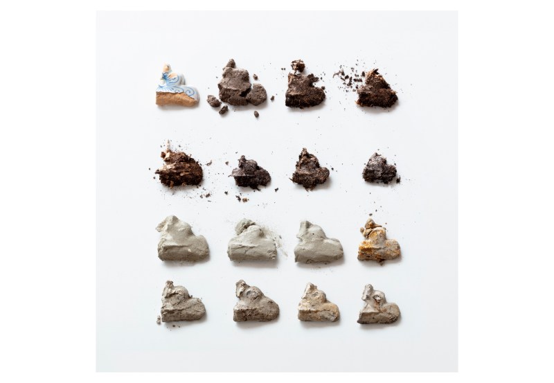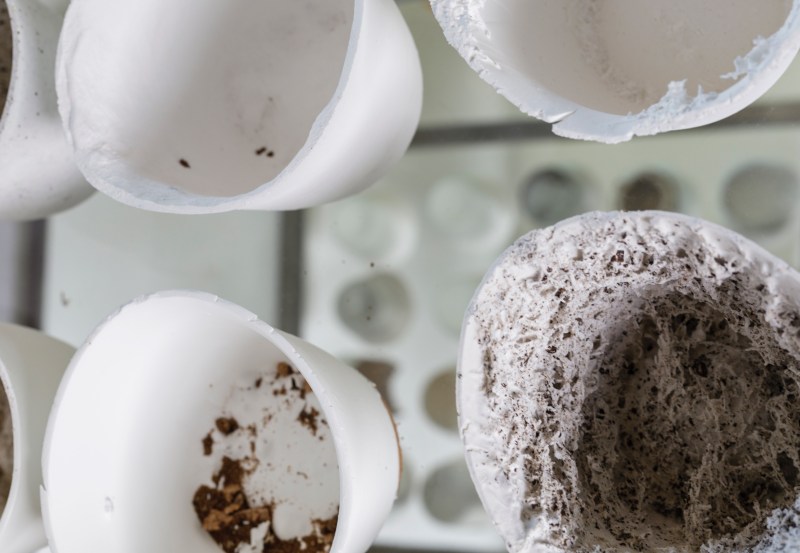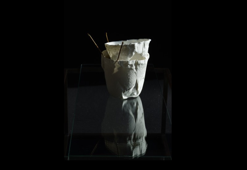 with till (keileem), North Sea Mammoth Fossils Porcelain, Mosses- Dunes Iron Age pottery shards Porcelain, Plantscape III cast outside and cast inside of plantmade Biodigital Eggshell Porcelain: sunlight, reflection, substance of shadow; photo Theo Mahieu.