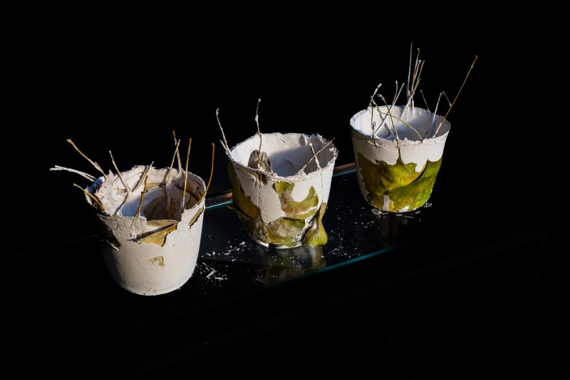 Oo Ichou, 2024. Raw porcelain meets living botanical heritage. (Left) ultra-thin translucent eggshell porcelain – (middle) recycled crushed re-fired porcelain – (right) glazed. Made during the artist-in-residency at Kouraku Kiln in Arita, Japan with imprints of leaves of Oo Ichou, as the locals lovingly call the 1000-year-old Ginkgo tree in their midst, while also utilizing 3D technology. Presented during ‘Seeking the light of the shadow’ in Arita, Japan.‘Overlevers | Survivors’ is a hommage to Ginkgo biloba, said to be a living fossil or ‘a tree that time forgot’ (Peter Crane). A survivor, understood to be unchanged for 200 million years through several mass extinctions and regarded as the oldest surviving plant. Deeply intertwined with the prehistoric planet. Nurtured, valued and saved from extinction by human beings.Plantscape #2, 2023-2024. Raw porcelain meets botanical heritage. Ginkgo leaves from oldest Ginkgo in the Netherlands, brought by VOC botanists from Japan and planted at Oude Hortus, botanical garden University Utrecht in 1735. The leaves are in the process of making imprints themselves of living/drying/dying in drying/shrinking raw porcelain.A future trace fossil, for unknown posterity.Raw porcelain with leaves from Ginkgo trees in the botanical garden Utrecht (planted in 1730) and the botanical garden in Leiden (planted in 1785), 2023.